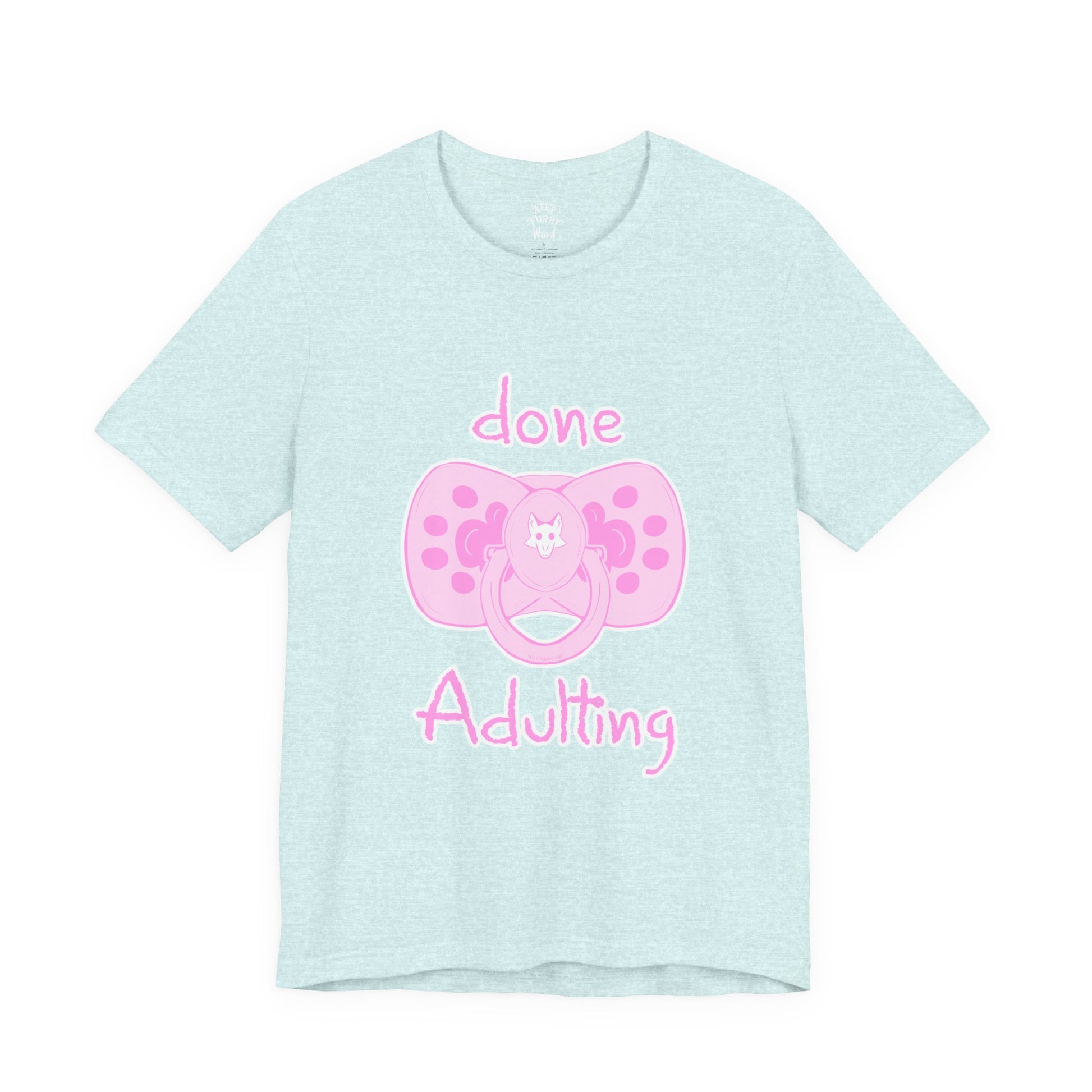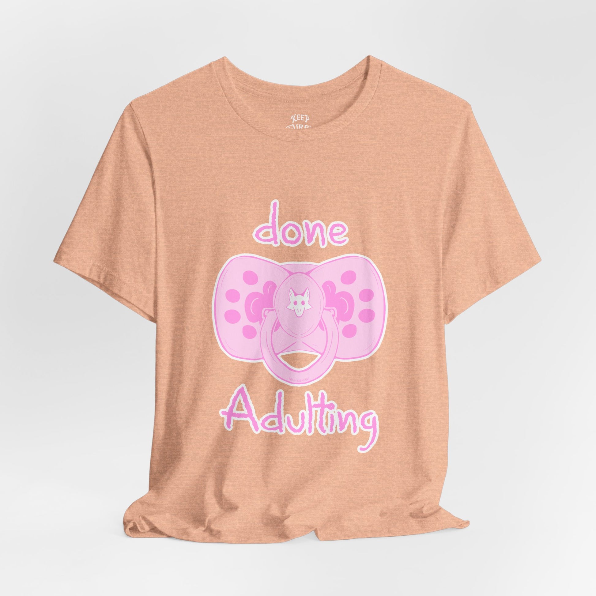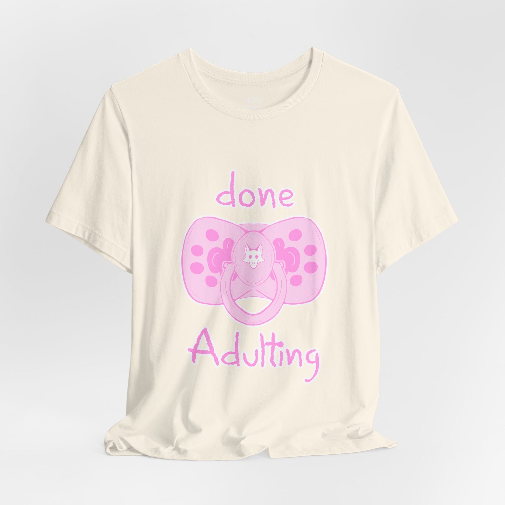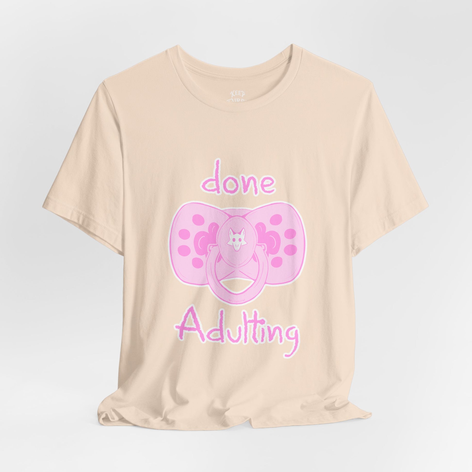 For when bills, emails, and responsibilities have officially won. The Done Adulting Tee by AJ is the ultimate declaration of surrender. Featuring a soft pink pacifier graphic and playful text, this design blends humor, comfort, and a little bit of nostalgia for simpler days.