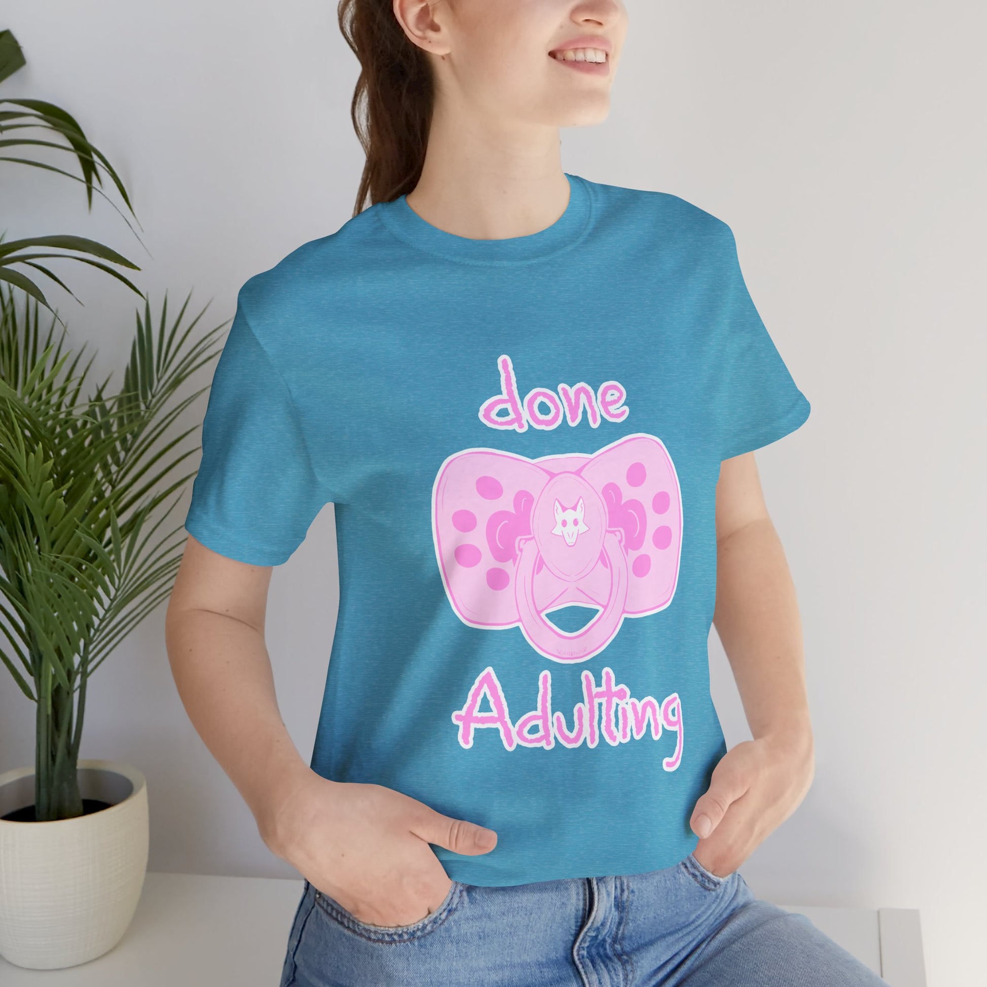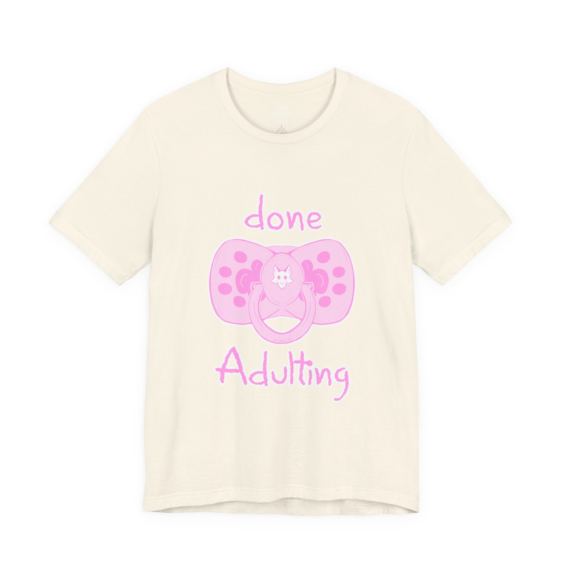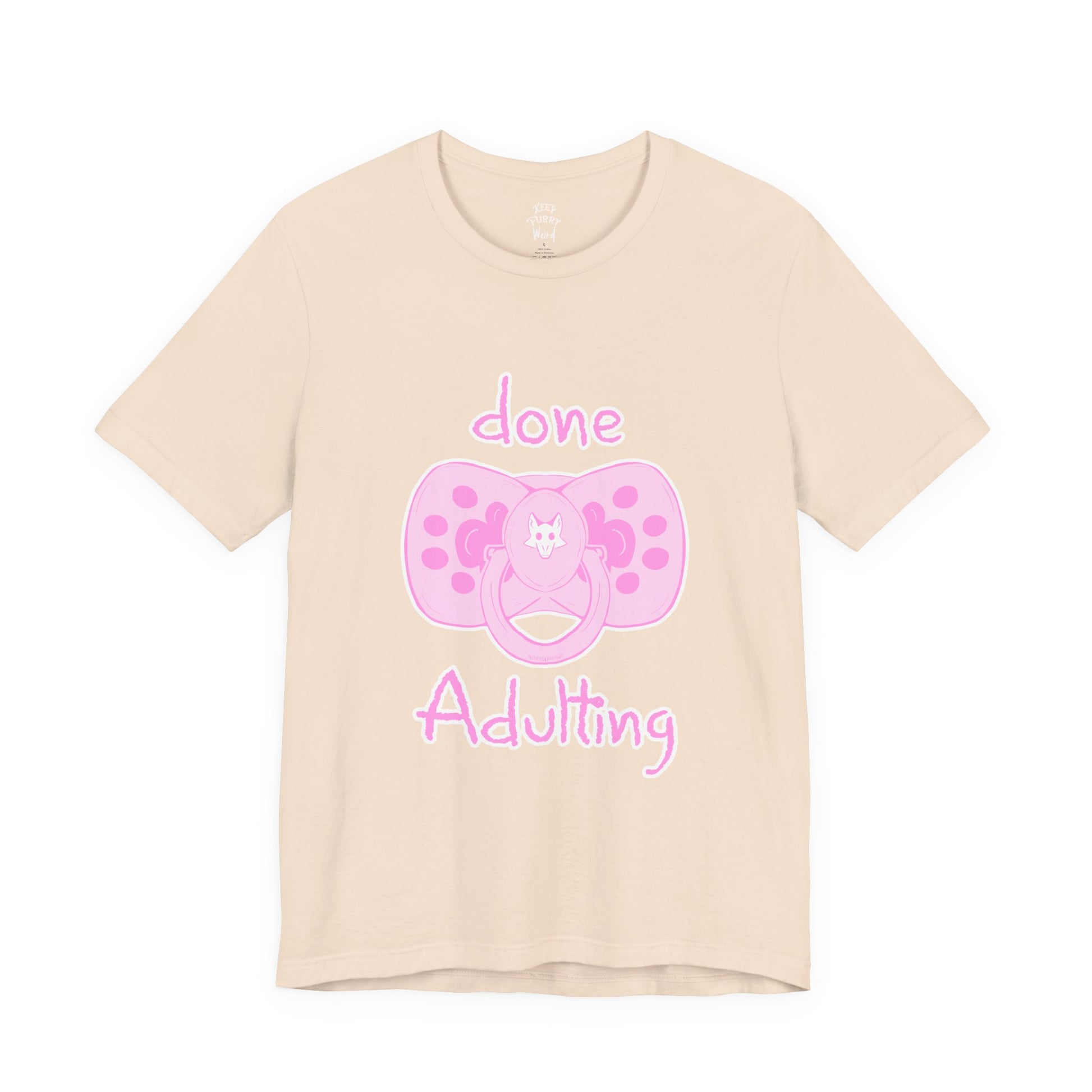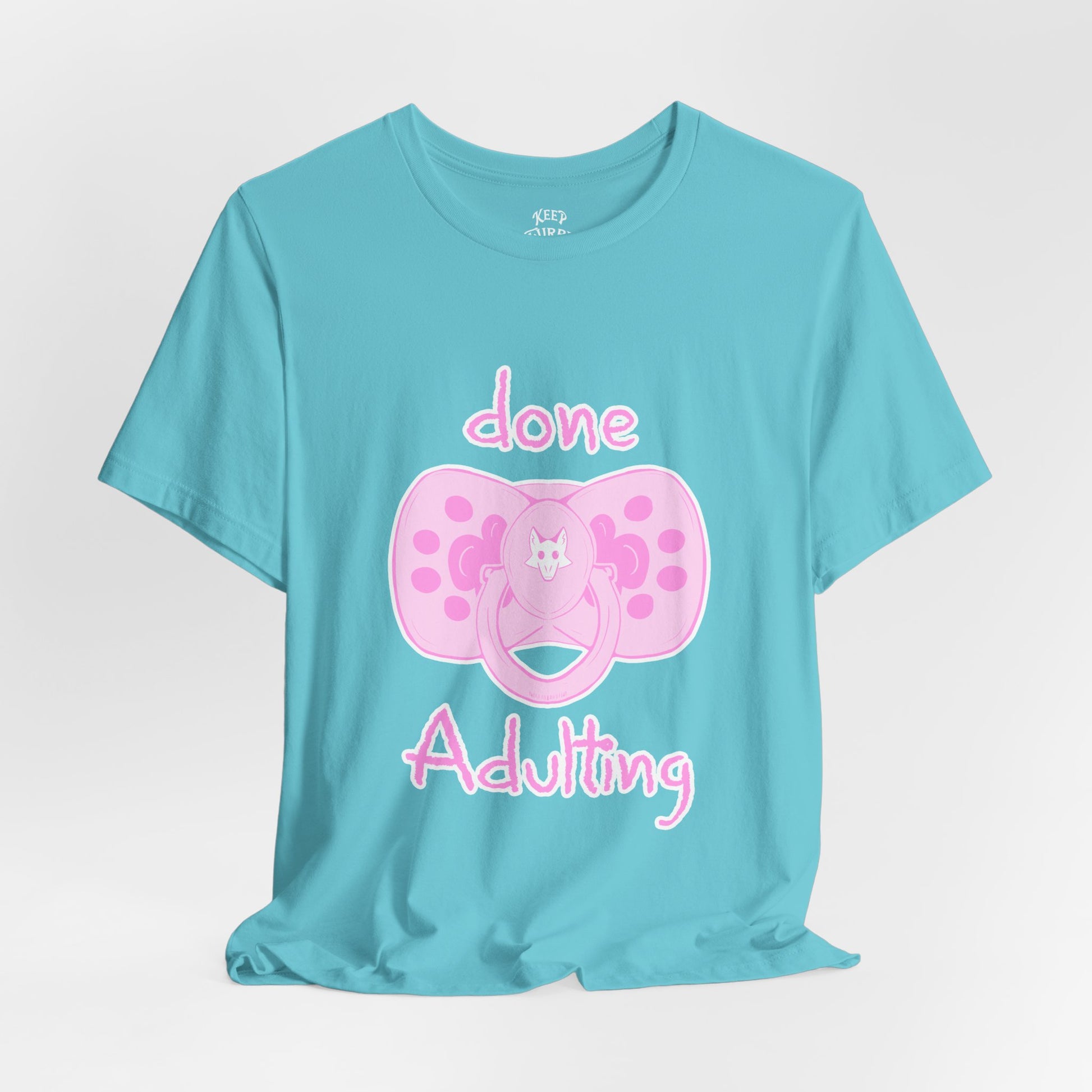 For when bills, emails, and responsibilities have officially won. The Done Adulting Tee by AJ is the ultimate declaration of surrender. Featuring a soft pink pacifier graphic and playful text, this design blends humor, comfort, and a little bit of nostalgia for simpler days.