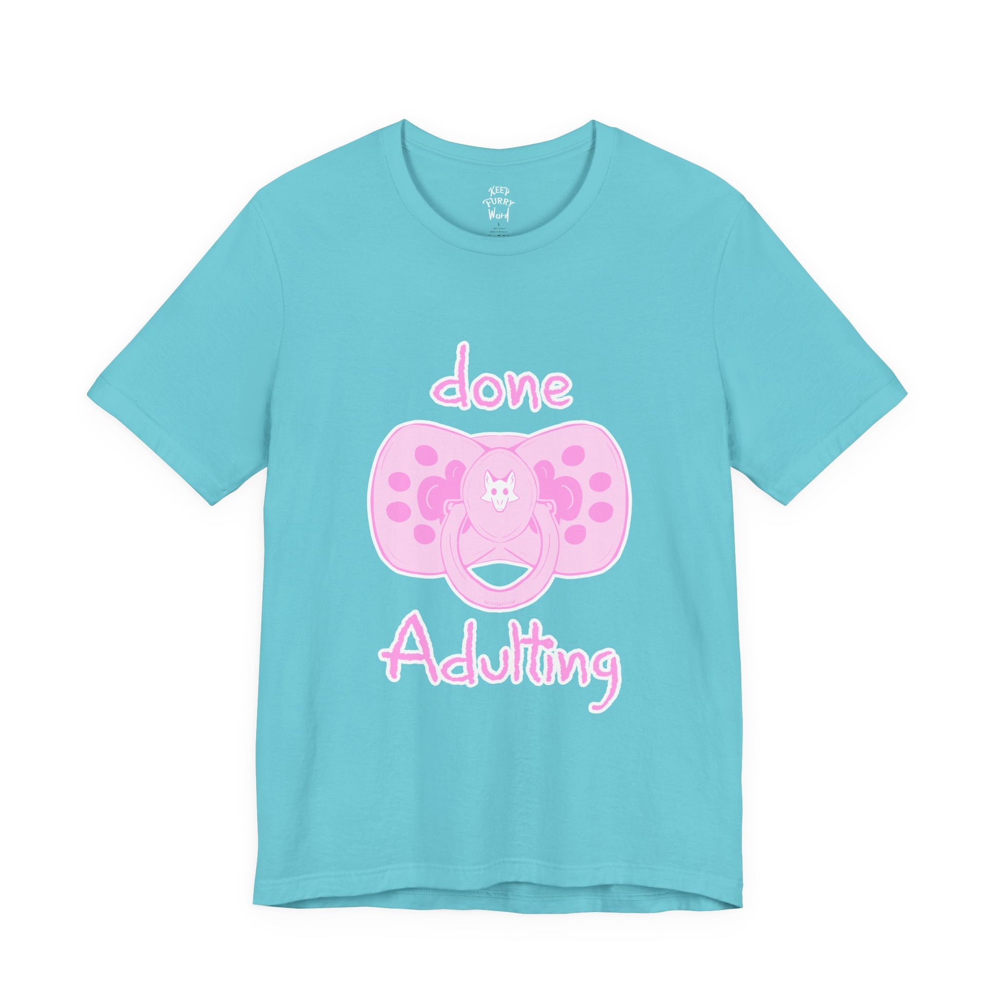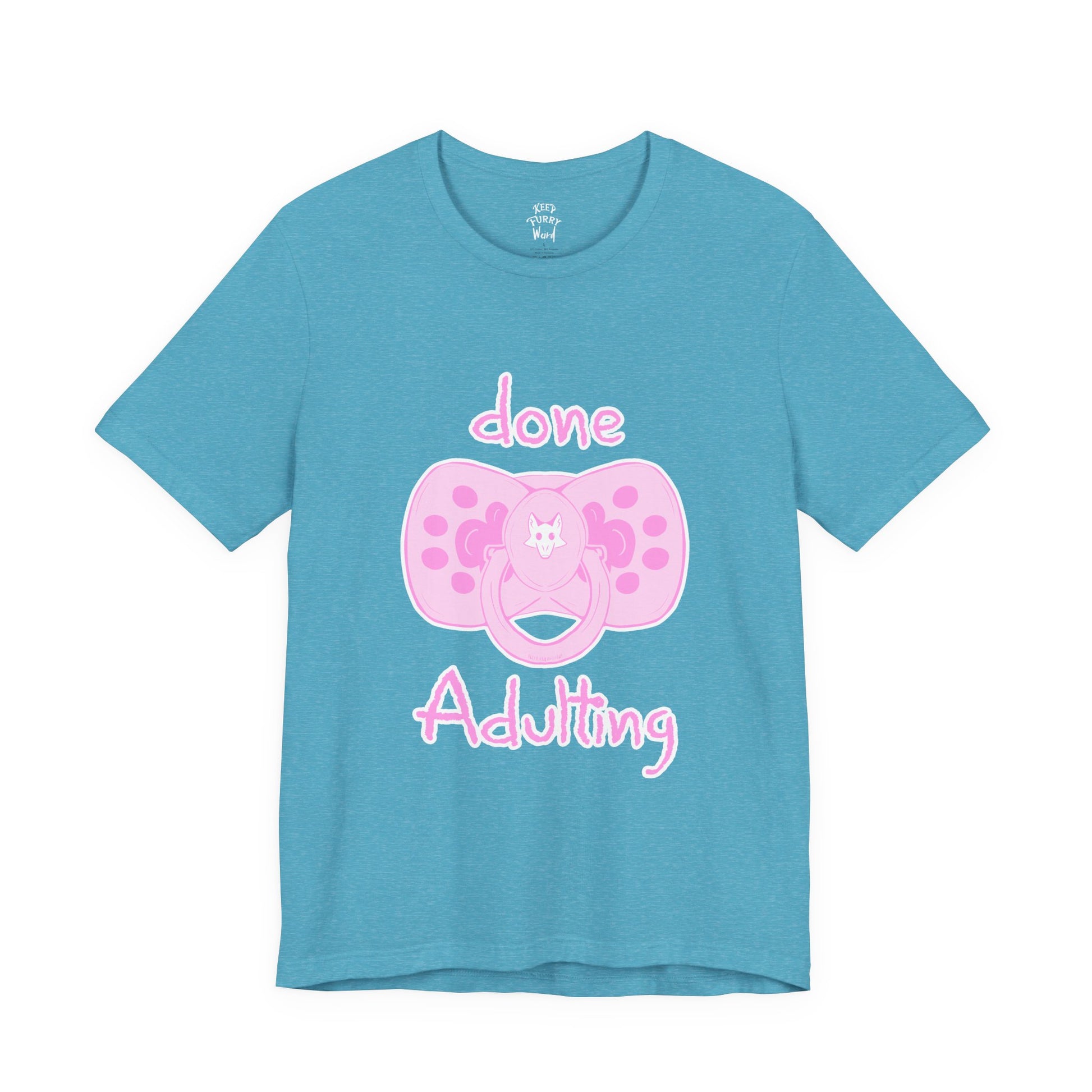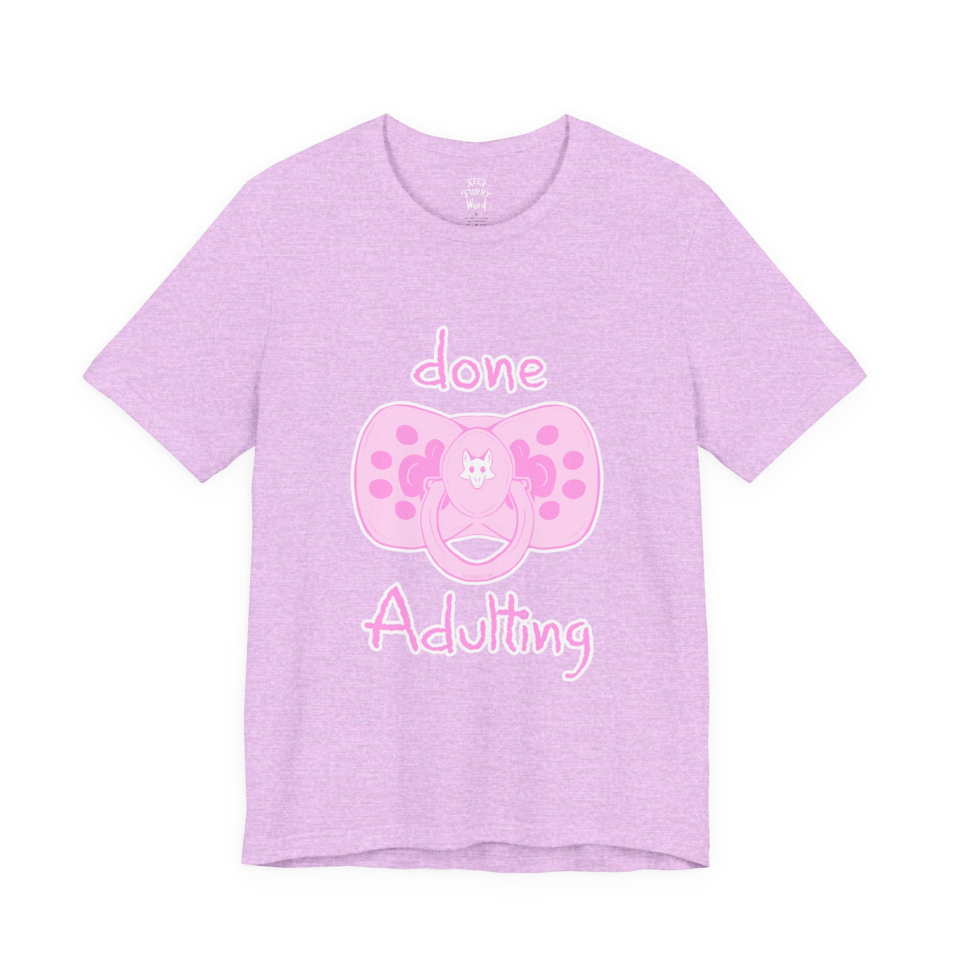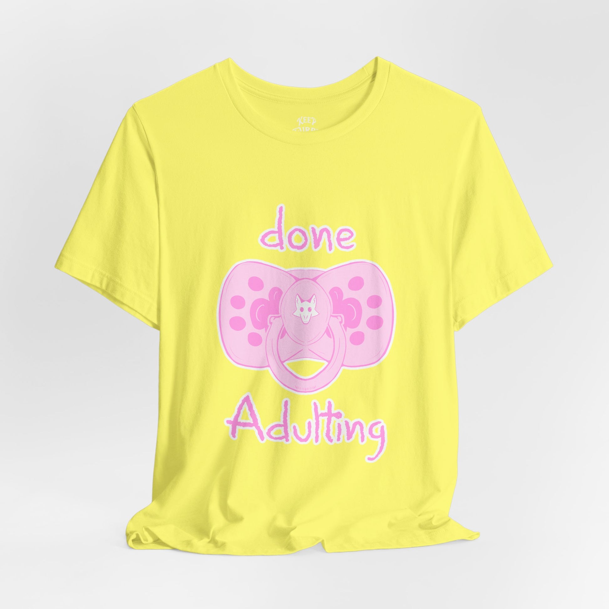 For when bills, emails, and responsibilities have officially won. The Done Adulting Tee by AJ is the ultimate declaration of surrender. Featuring a soft pink pacifier graphic and playful text, this design blends humor, comfort, and a little bit of nostalgia for simpler days.