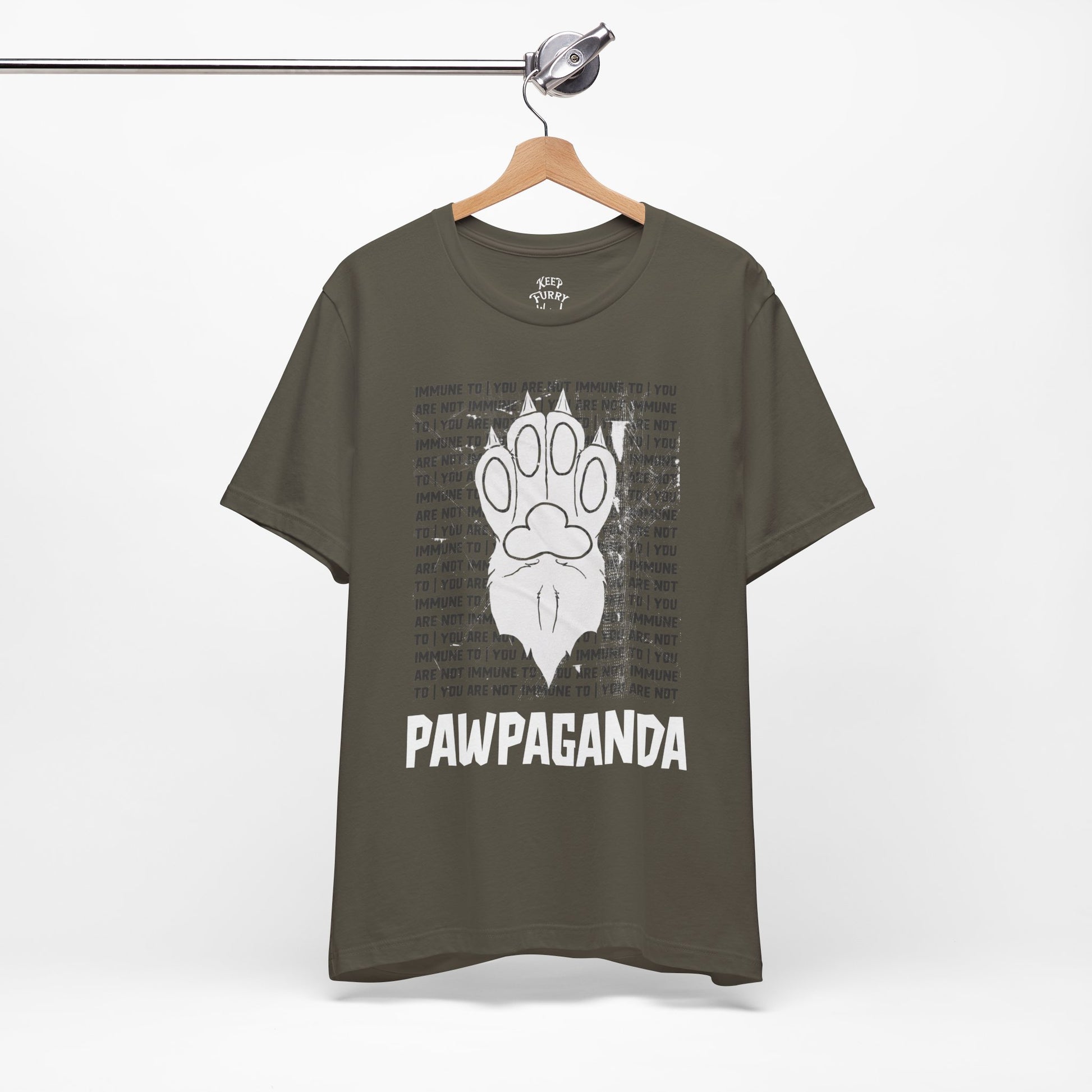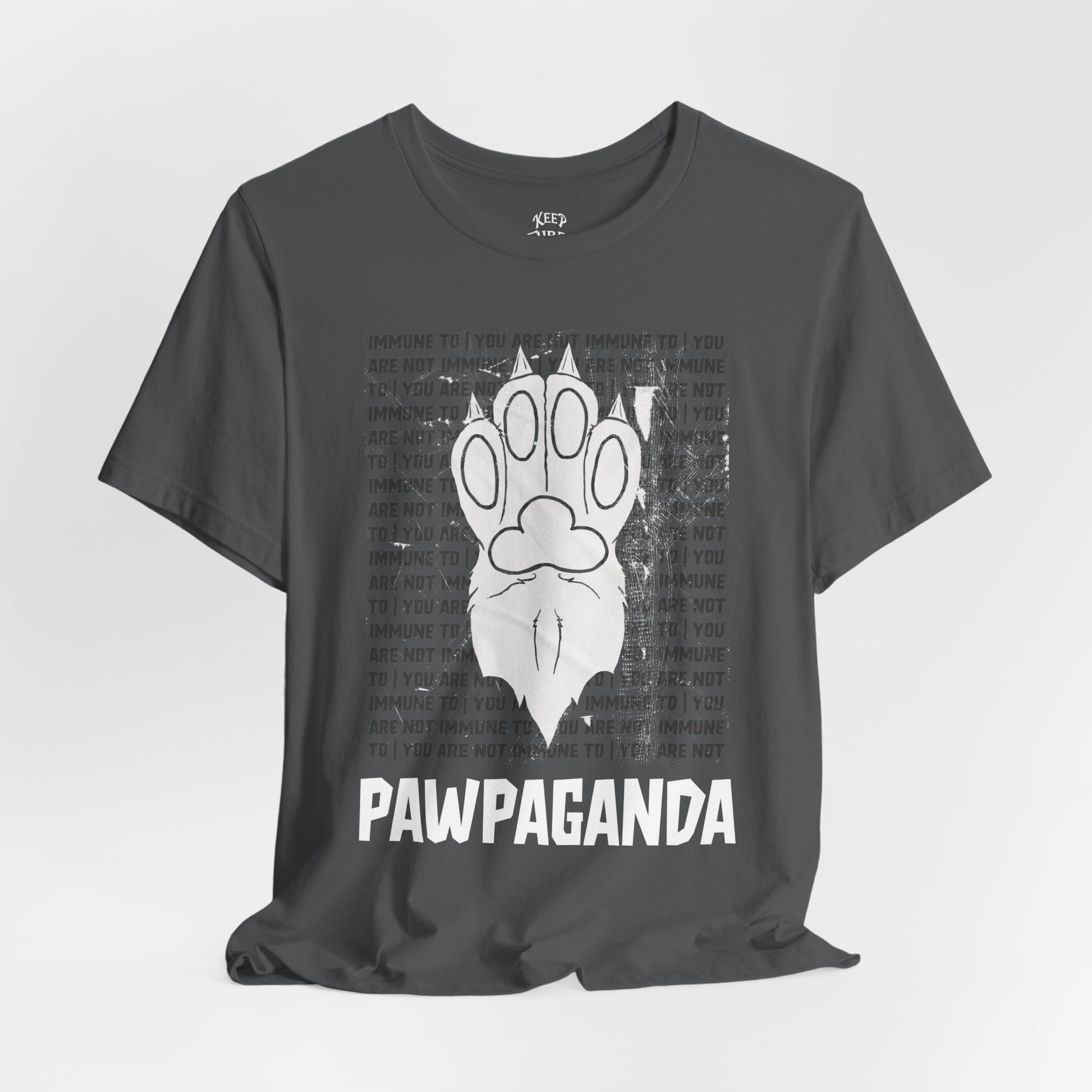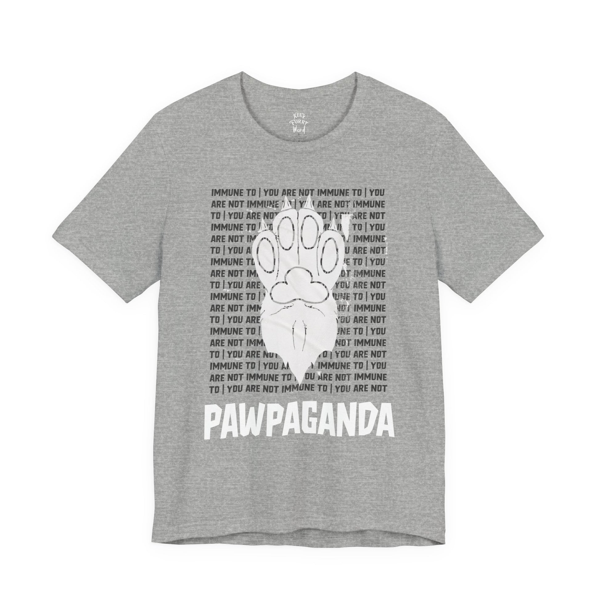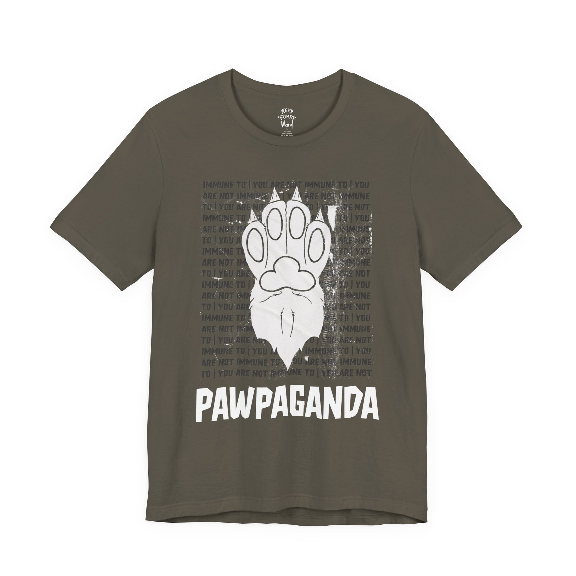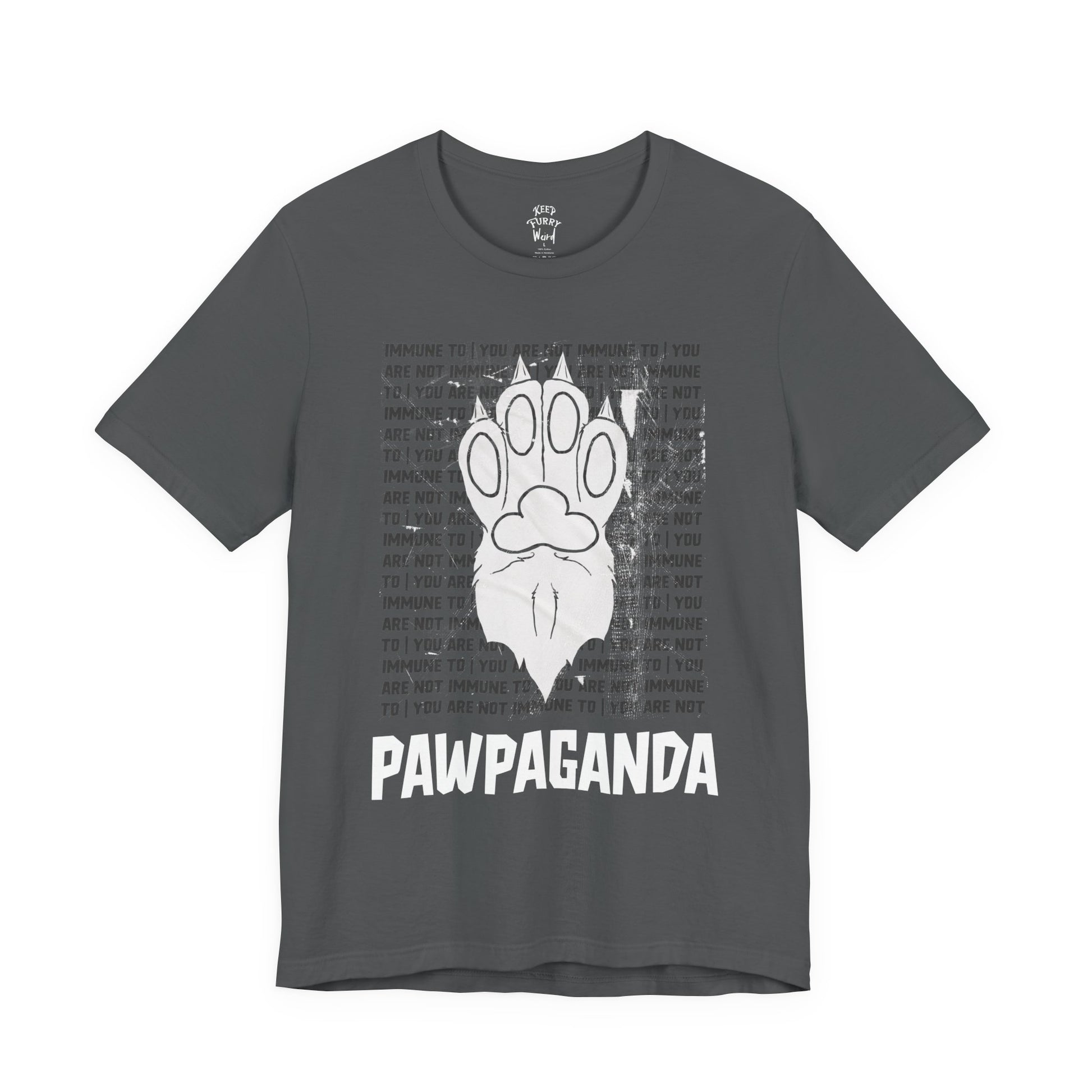 You are not immune to the Pawpaganda. Designed by AJ, this striking tee blends old-school propaganda aesthetics with furry humor. Are you ONE OF US?!