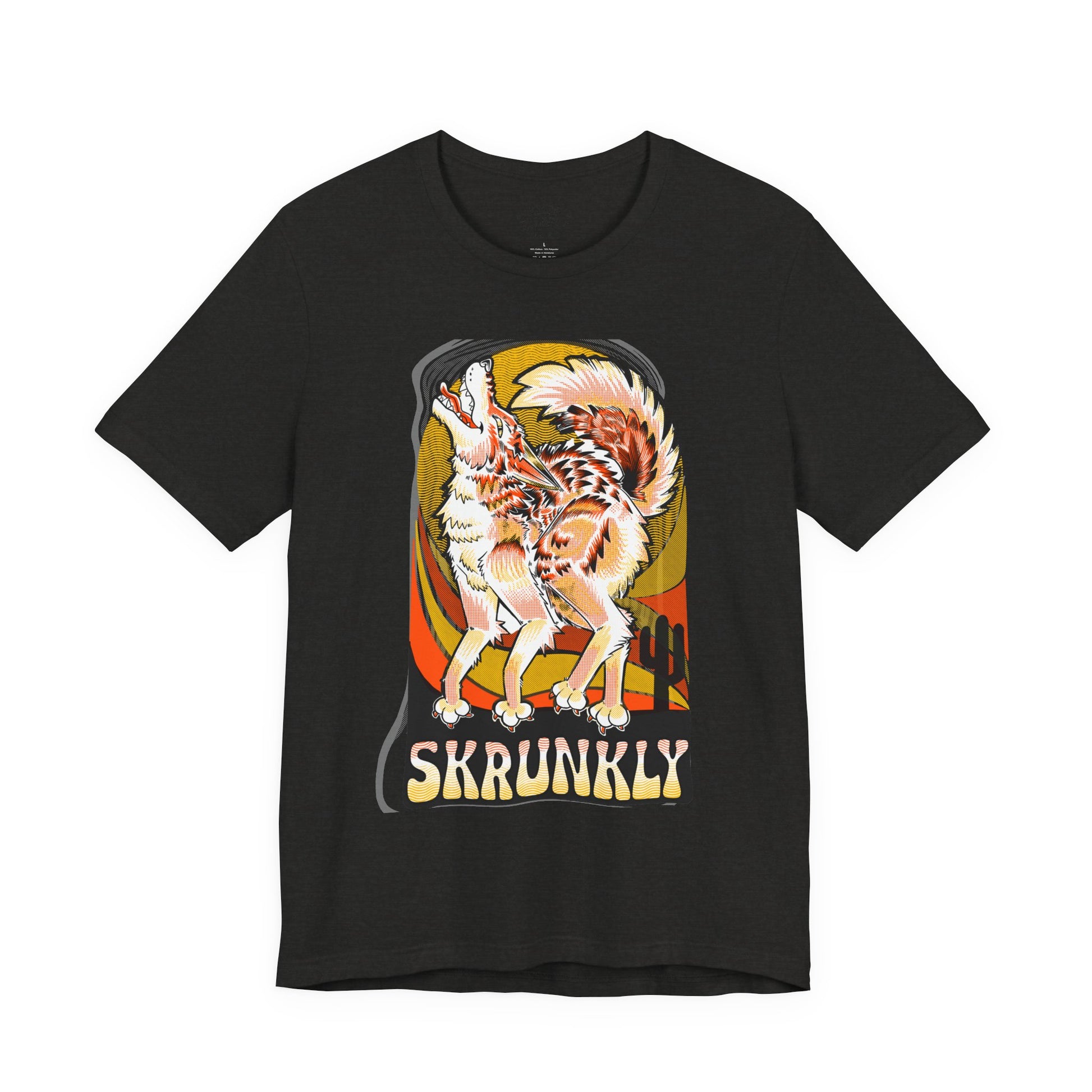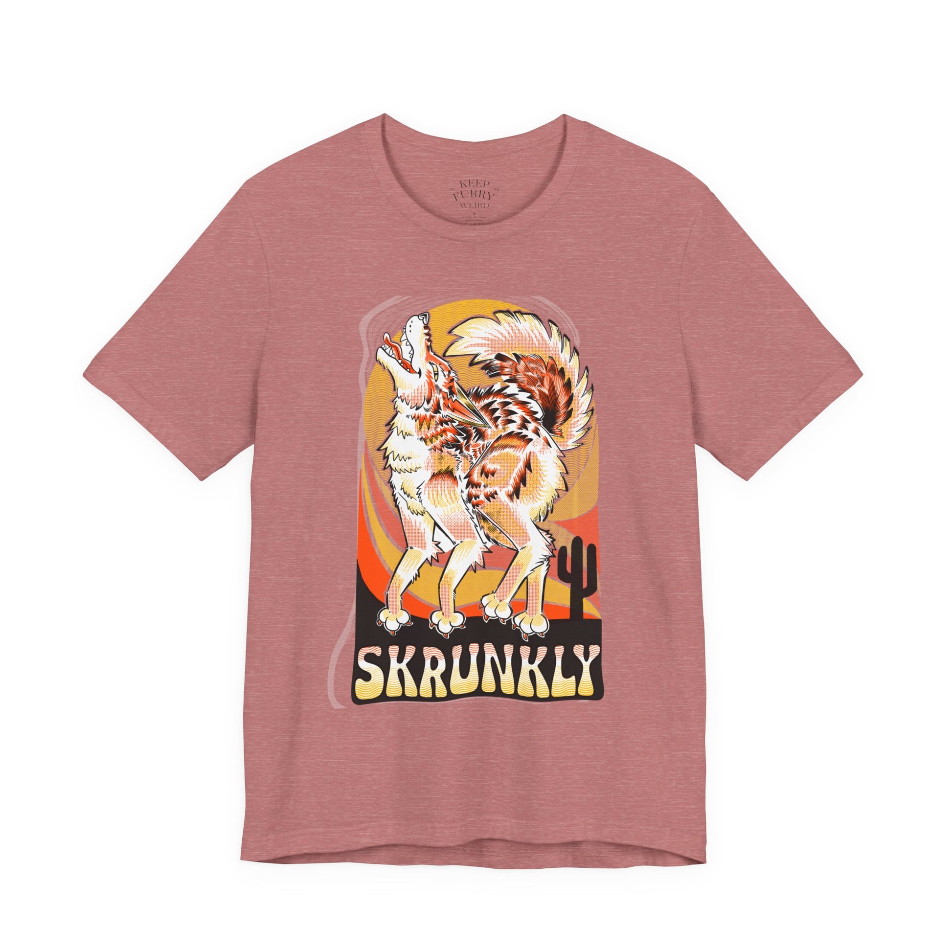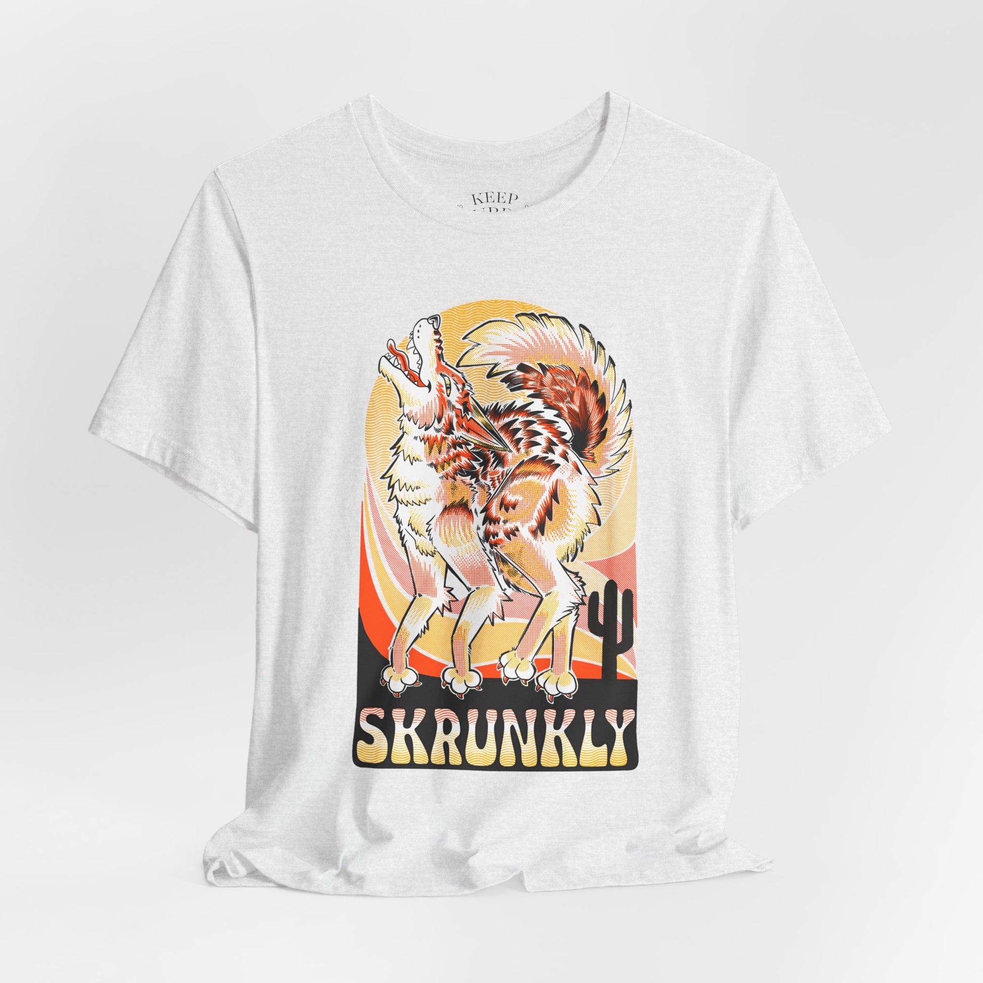 Celebrate the scrappy side of life with the Skrunkly Desert Coyote Tee, featuring artwork by Ash Fox. With bold retro desert tones and a gloriously “skrunkly” howling coyote front and center.